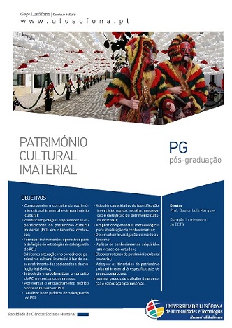 O património cultural tem de ser visto na sua unidade: material e imaterial. É essa a política de futuro. E nesse sentido, que a Universidade Lusófona vao realizar um Curso de Pós-graduação em Património Cultural Imaterial a partir de 18 de Novembro de 2011 até 14 de Abril de 2012. Decorrerá às Sextas-feiras e aos Sábados entre as 9H30 - 12H30 e as 14H00 - 17H00.