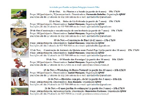 A Quinta Pedagógica Armando Villar propõe para os meses de Outubro e Novembro um conjunto de Workshops para a toda a Família poder preencher os seus fins-de-semana de uma forma diferente!